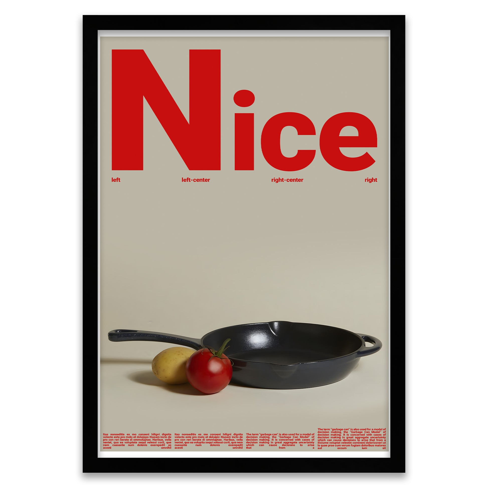 Elevate your kitchen decor with this minimalist graphic print, featuring the word "Nice" in large red letters above a cast-iron skillet and fresh vegetables. The artwork blends a clean layout style with realistic imagery, creating a contemporary and slightly playful vibe.