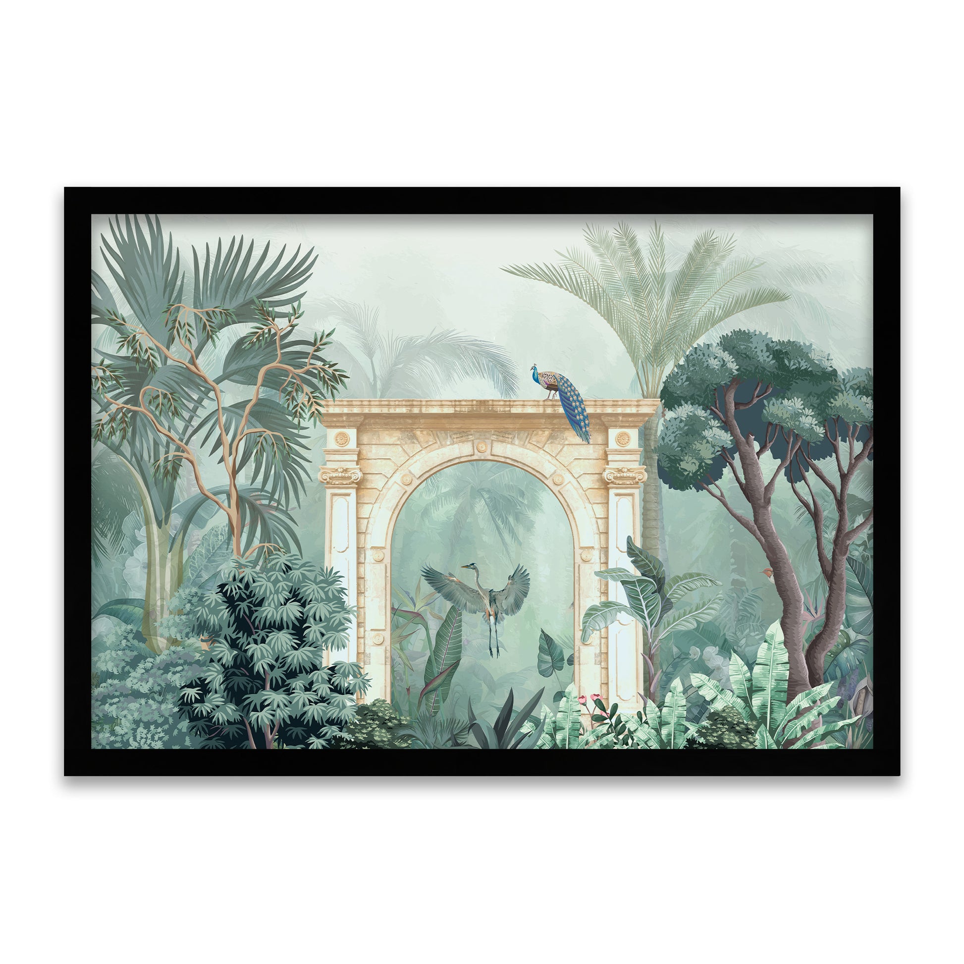 A majestic peacock watches from above while a graceful heron takes flight within the arch, adding to the magical atmosphere. This high-quality Poster, with its vintage mural style and calming green palette, is the perfect Wall Decoration to bring a sense of mystery and sophisticated tranquility to your living room or bedroom.