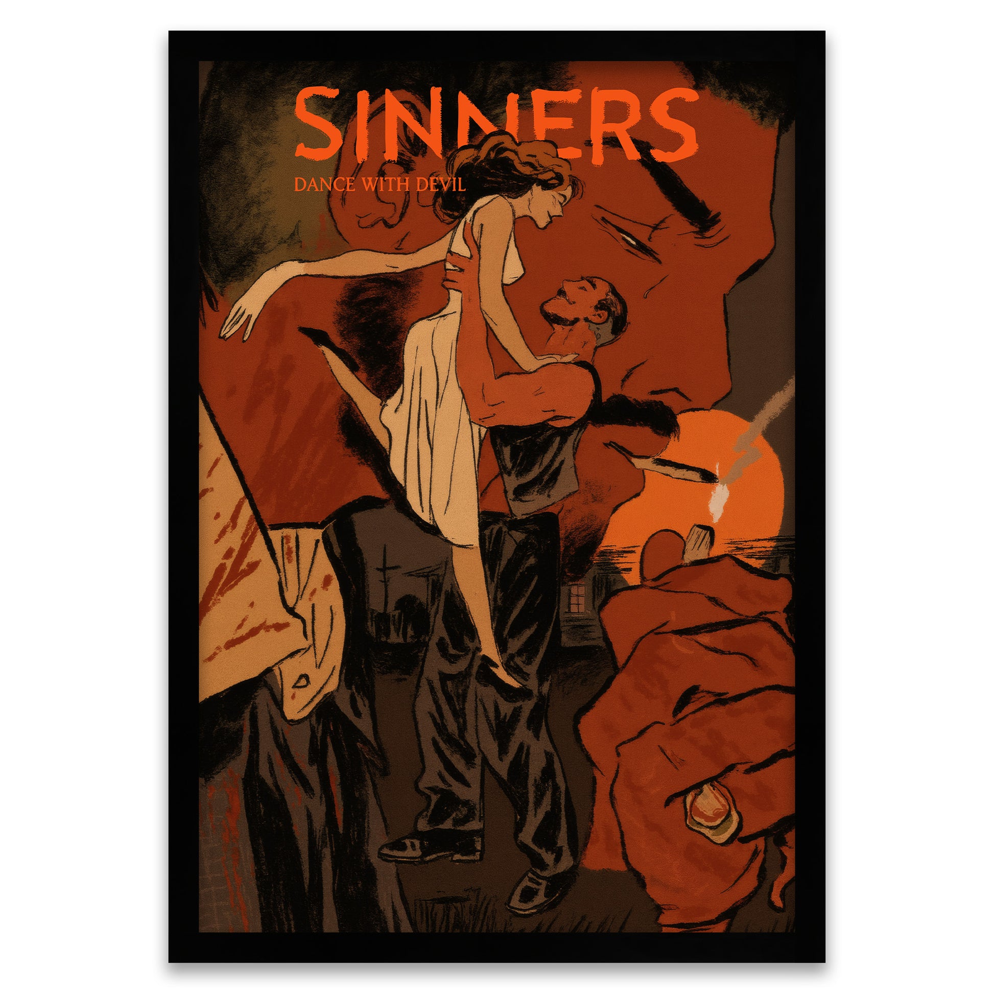Dieses Kunstwerk besticht durch seine skizzenhafte, handgezeichnete Ästhetik, die den Druckstil alter Comics oder Romanhefte imitiert. Der leuchtende orangefarbene Sonnenuntergang bildet einen scharfen Kontrast zu den dunklen, schweren Schatten der Figuren und erzeugt eine Szene voller Spannung.