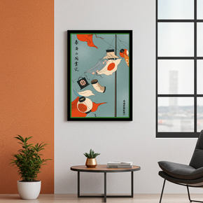 Entdecke den freudigen Geist dieses exquisiten Designs, das an klassische japanische Ukiyo-e Holzschnitte erinnert. Das Kunstwerk zeigt verschiedene traditionelle Elemente wie Drachen, Laternen und eine japanische Flagge, die anmutig vor einem ruhigen blauen Himmel flattern. Dieses Wandbild ist ein essenzielles Stück, um deinem Raum einen Hauch von anspruchsvoller Ruhe, künstlerischem Erbe und ein lebendiges Farb-Statement zu verleihen.
