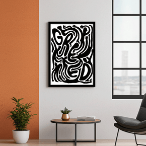 Provoziere Gedanken mit kraftvollem Design. Diese auffallende Illustration formt das Wort "GREED" aus fliessenden, verzerrten menschlichen Silhouetten.
