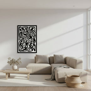 Entdecke die künstlerische Botschaft, die in diesem kühnen Schwarz-Weiss-Druck verborgen liegt. Das Kunstwerk arrangiert verdrehte Figuren auf geniale Weise, um den Titel zu buchstabieren, und verbindet so abstrakte Kunst mit bedeutungsvoller Typografie.