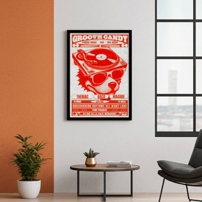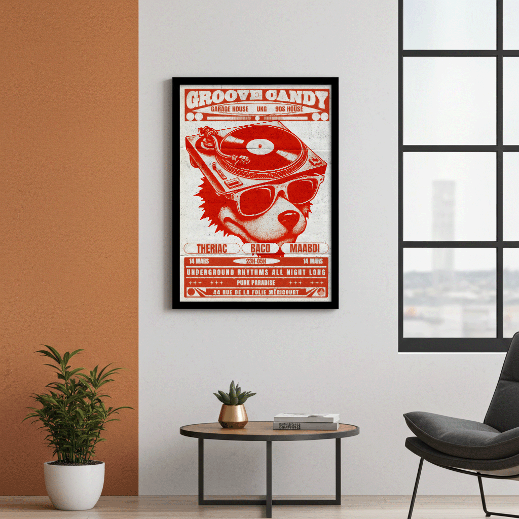 Fange den rohen Puls der Tanzfläche ein mit dieser dynamischen Illustration im Distressed-Poster-Stil, die einen stylischen DJ-Hund und einen klassischen Plattenspieler zeigt. Das Kunstwerk verwendet eine auffallende rot-weisse Zweifarben-Grafik, um die Energie und raue Ästhetik von Vintage-Konzertwerbung hervorzurufen.