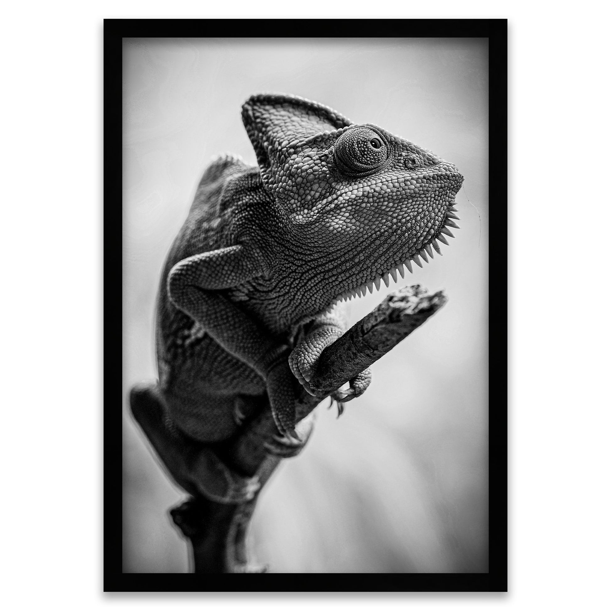 Spüre die uralte Textur der Natur. Dieser umwerfende schwarz-weisse Chamäleon-Kunstdruck fängt jede einzelne Schuppe ein, als wäre sie aus Stein gemeisselt.