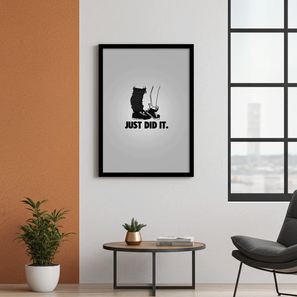 Der Slogan "JUST DID IT." liefert die Pointe mit selbstbewusster Einfachheit und zeigt, dass du das Leben nicht zu ernst nimmst. Das Design verkörpert eine coole, urbane Ästhetik, die sich nahtlos in zeitgenössische Einrichtungen einfügt. Ideal für das Schlafzimmer oder die Männerbude, verleiht dieser Kunstdruck deinen Wänden eine ordentliche Portion Persönlichkeit.