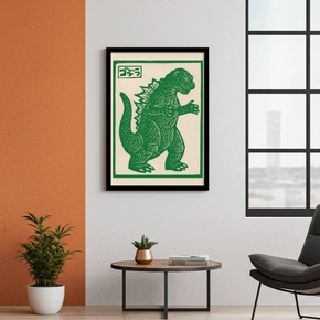 Erlebe den Retro-Charme dieses einzigartigen Grafikdrucks, der die ikonische Silhouette eines riesigen Monsters in tiefem Grün zeigt. Die raue Linolschnitt-Textur und die japanische Typografie huldigen dem klassischen Kino und traditionellen Kunstformen. Dieses Wandbild ist ein essenzielles Stück, um deinem Raum Vintage-Popkultur-Flair, kühne Farbe und einen Hauch von Nostalgie zu verleihen.