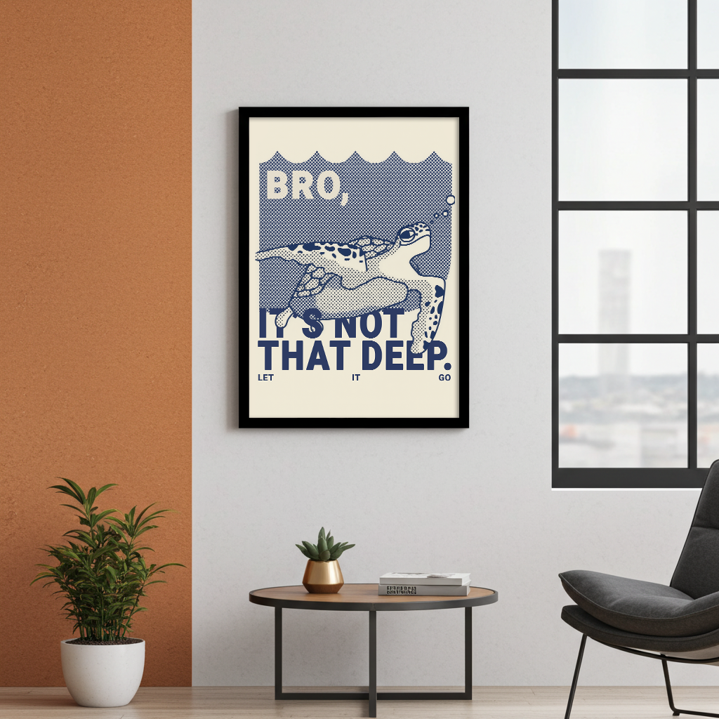 Erlebe die entspannte Energie dieser lustigen, modernen Illustration, die eine ruhige Meeresschildkröte mit einem lässigen, witzigen Zitat kombiniert. Das Kunstwerk verwendet ein grafisches Rastermuster in tiefem Blau, was dem Stück eine klare Comic- oder Pop-Art-Ästhetik verleiht.