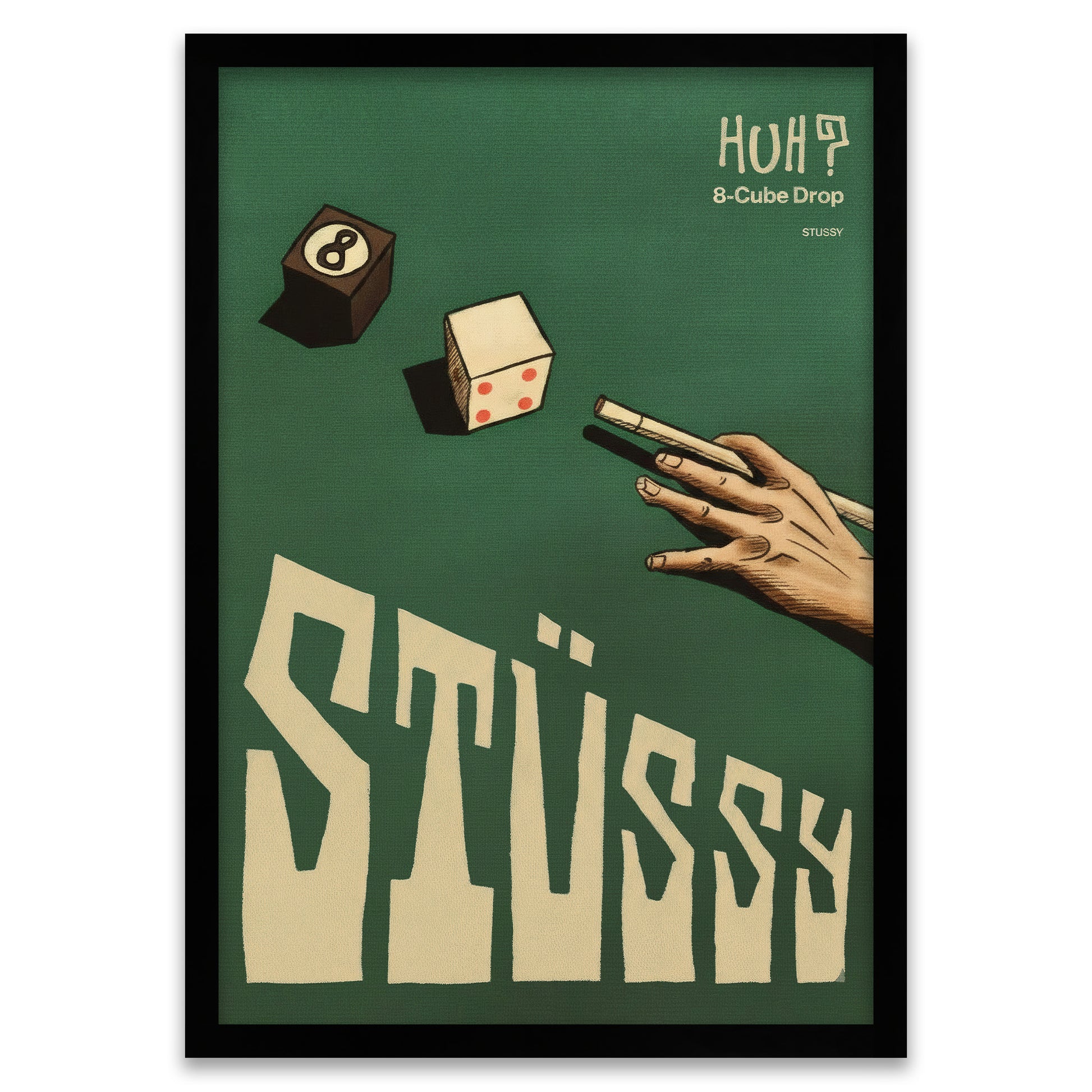 Bringe dein Interieur auf das nächste Level mit diesem schrulligen und stylischen Grafikdruck, der eine klassische Billardszene neu interpretiert. Das Kunstwerk zeigt eine Hand beim Stoss, doch statt Kugeln werden Würfel getroffen – darunter ein einzigartiger 8-Ball-Würfel – vor einem satten, texturierten grünen Hintergrund.