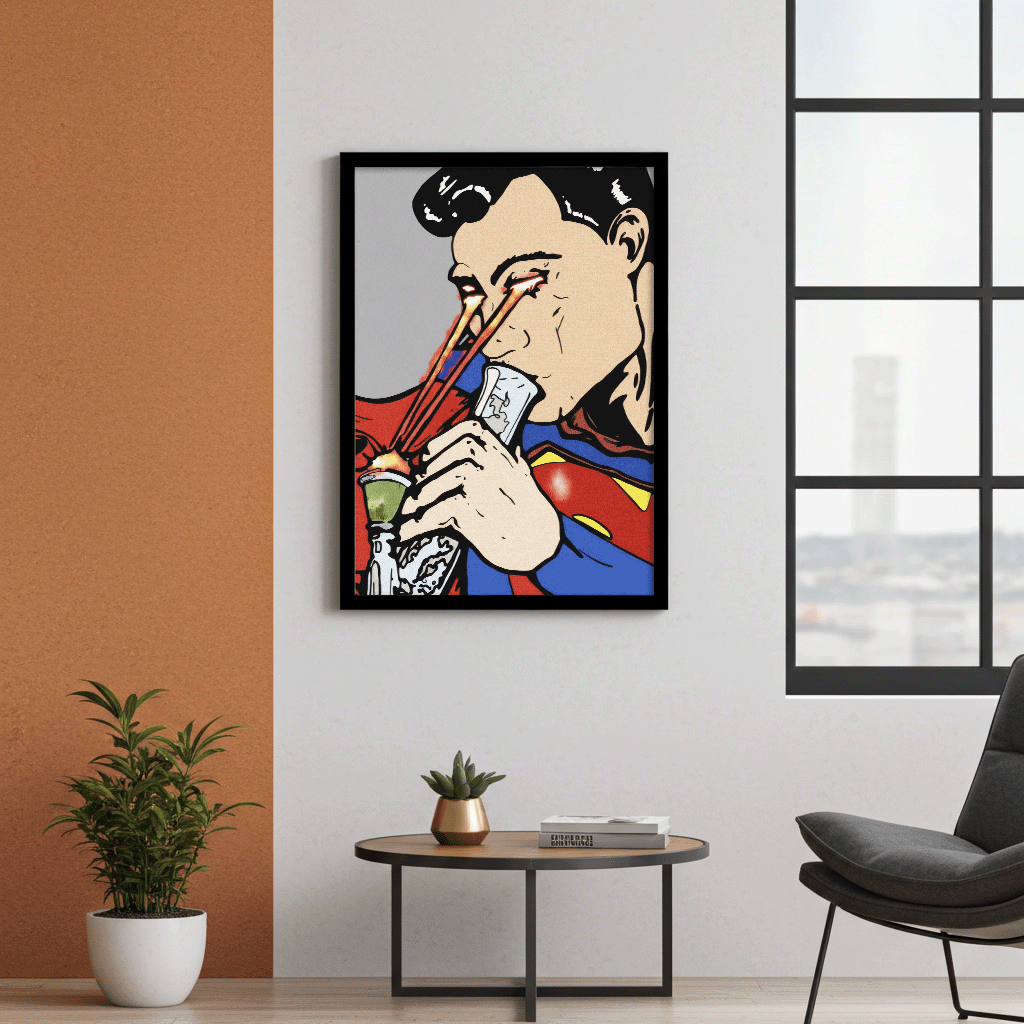 Bringe einen Funken Rebellion in deinen Raum mit diesem kühnen Druck im Comic-Stil, der einen legendären Superhelden zeigt, der seine Kräfte für einen einzigartigen Zweck nutzt. Das Kunstwerk verwendet lebendige Primärfarben und dicke schwarze Konturen, was die Vintage-Pop-Art-Ästhetik perfekt einfängt.