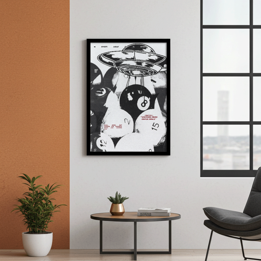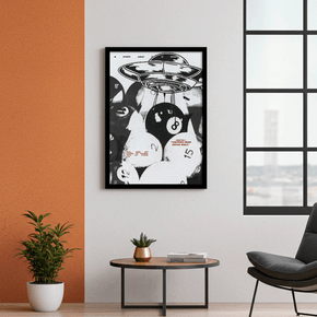 Entschlüssele die Ebenen dieses Verschwörungs-Drucks, der kontrastreiche Grafiken mit einer Vintage Comic-Ästhetik verbindet. Das Kunstwerk zeigt eine klassische fliegende Untertasse, die einen Billard-8-Ball aus einer unheimlichen Menschenmenge entführt, untermalt vom Slogan "Visitors from Outer Space."