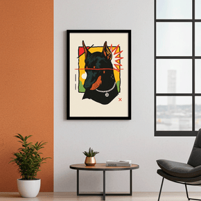 Fange den scharfen, fokussierten Blick dieses unverwechselbaren Dobermann-Porträts ein, das in einer knackigen, hochstilisierten Grafikmanier dargestellt wird. Das Kunstwerk verwendet eine lebendige Palette aus Rot, Gelb und Schwarz, untermalt von energiegeladenen Comic-Elementen wie dem Stern und der horizontalen Linie.