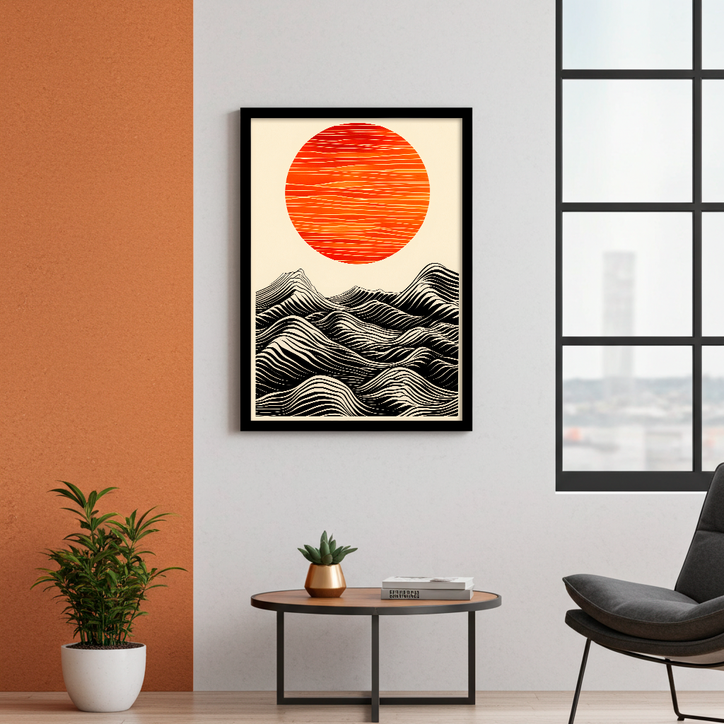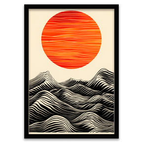 Lass dich vom visuellen Rhythmus mitreissen von diesem atemberaubenden Design, in dem die grosse, horizontal texturierte rote Sonne auf ein komplexes Muster von geschwungenen schwarzen und cremefarbenen Linien trifft. Das Kunstwerk nutzt klare visuelle Techniken, um die Illusion von Bewegung und Tiefe zu erzeugen und das Auge über die Wellen zu ziehen.