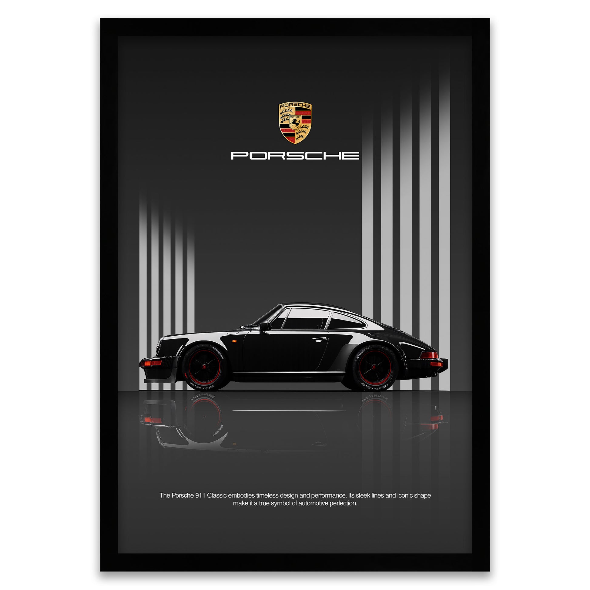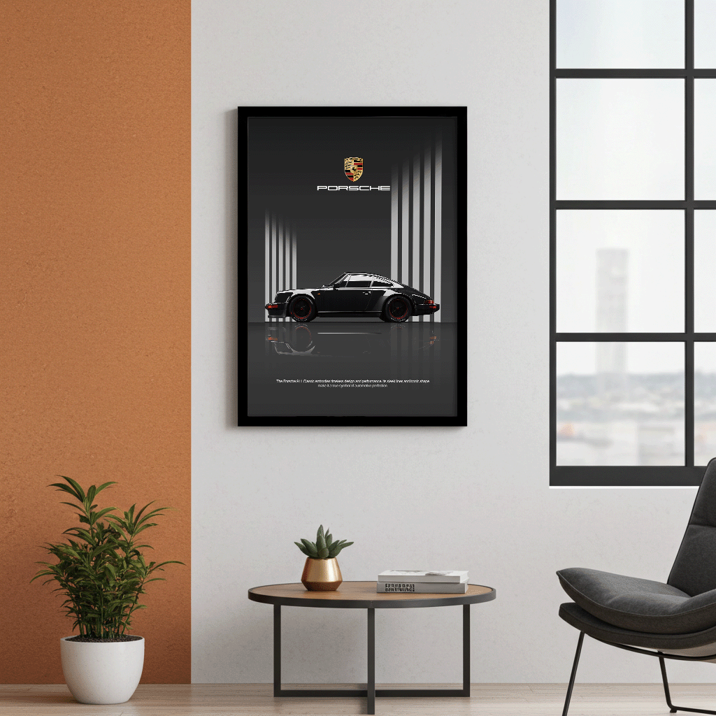 Dieser hochwertige Kunstdruck ist eine Hommage an eines der ikonischsten Autos aller Zeiten. Das tiefe Schwarz des klassischen Elfers kontrastiert perfekt mit den dezenten roten Felgenakzenten und dem klaren, architektonischen Hintergrund. Dieses Wandbild nutzt Reflexionen und minimalistische Linien, um eine edle Atmosphäre zu schaffen, die in jedes moderne Interieur passt.