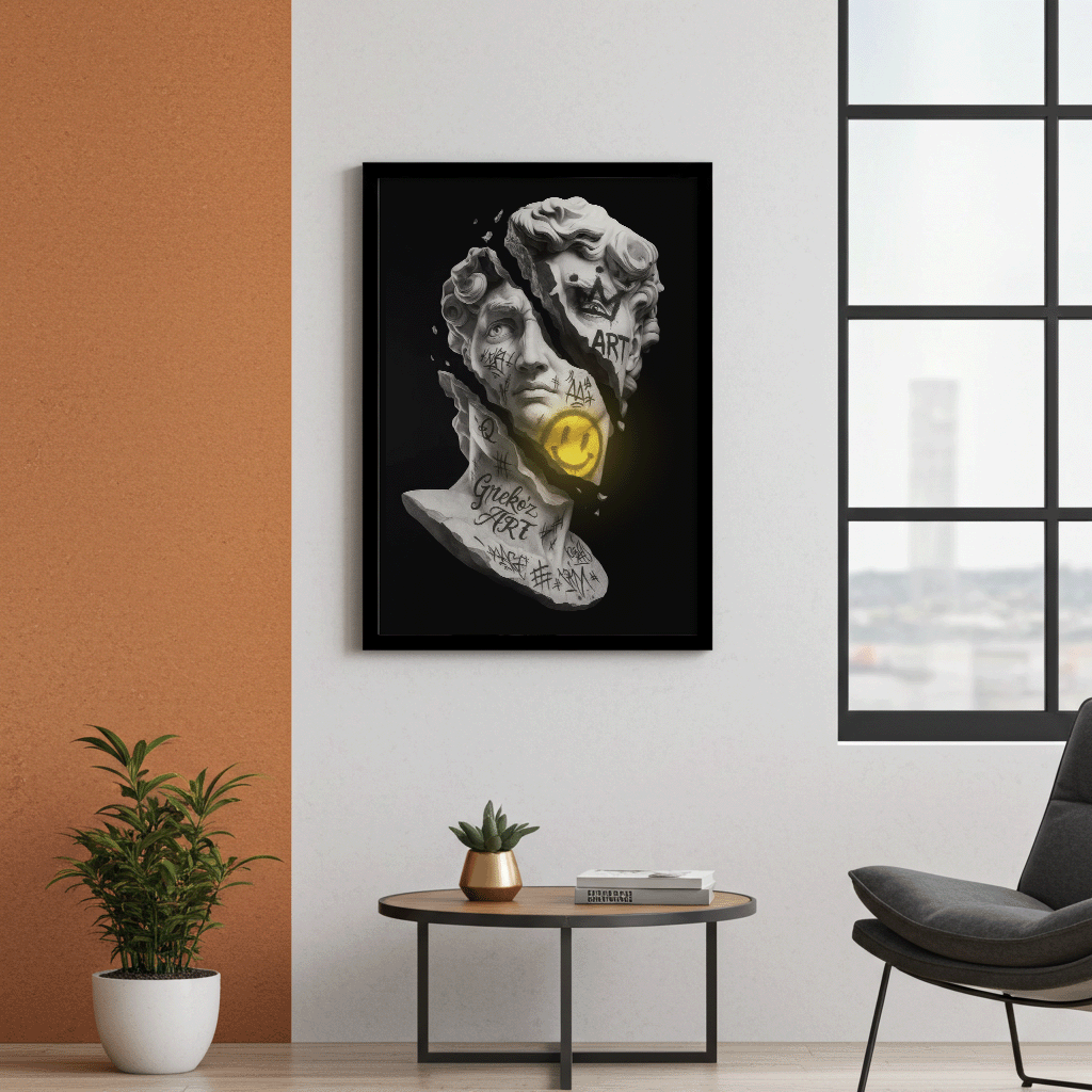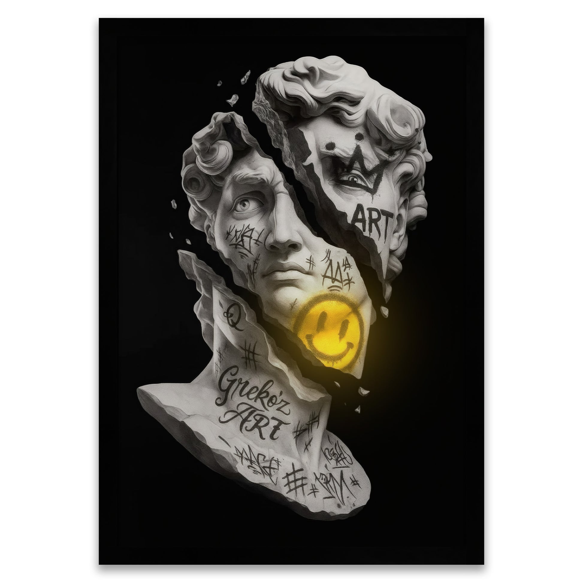 Fordere Konventionen heraus mit diesem kraftvollen, kontrastreichen Kunstwerk. Die Illustration zeigt eine klassische Büste, dramatisch zersplittert, um lebendige Graffiti, ein leuchtendes Smiley-Gesicht und aggressive Schriftzüge in ihren Rissen zu enthüllen. Der dunkle Hintergrund intensiviert die visuelle Wirkung und betont die Spannung zwischen antiker Form und zeitgenössischer Rebellion.